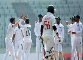প্রথম উইকেট হারানোর পর দ্বিতীয় উইকেটে কাসুজা-আরভিন ৫৮ রানের জুটি গড়ে প্রতিরোধ গড়ে তোলেন। দুই পেসার আবু জায়েদ রাহী-এবাদত হোসেন কৃপণ বোলিং করলেও উইকেটের দেখা পাচ্ছেন না। রাহী এক উইকেট তুলে নিলেও এবাদত এখনো খালি হাতে।
