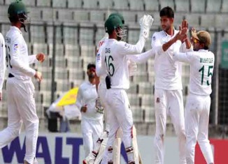 তবে মাসভাউরে আউট হলে ভাঙে শতাধিক রানের এই জুটি। ব্যক্তিগত ৬৪ রানে নাঈম হাসানের ঘূর্ণিতে পরাস্ত হয়ে তার হাতেই ক্যাচ দিয়ে সাজঘরে ফেরেন। তার ব্যাট থেকে আসে ১৫২ বলে ৬৪ রান। মাসভাউরের নিখুঁত টেস্ট ইনিংসটি সাজানো ছিল ৯টি চারে।